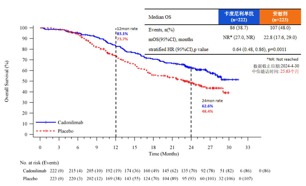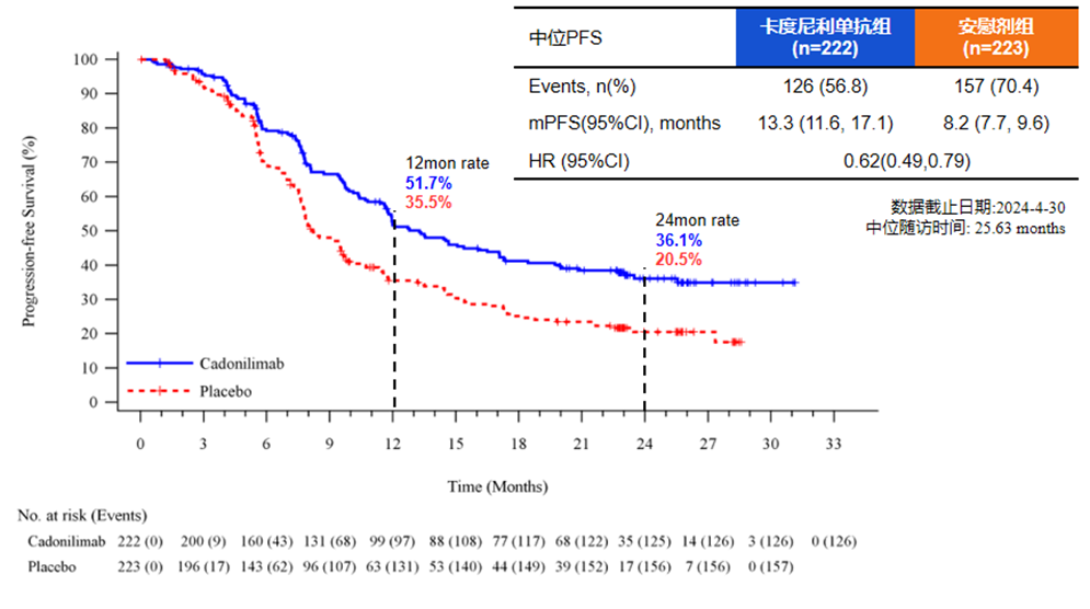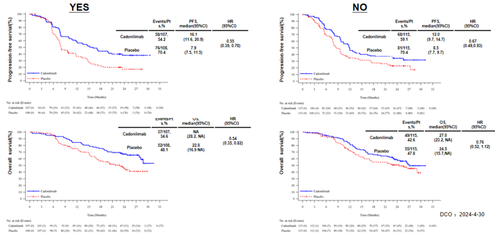 对于既往未接受同步放化疗(CCRT)的患者,加用卡度尼利单抗后mPFS可达12个月(vs 8.5个月),mOS为27个月(vs 24.5个月);既往接受CCRT的患者获益更显著,mPFS翻倍至16.1个月(vs 7.9个月),疾病进展或死亡风险降低45%。这表明卡度尼利单抗疗效不受既往CCRT治疗影响,无论是否接受过CCRT,卡度尼利单抗均显示生存优势。