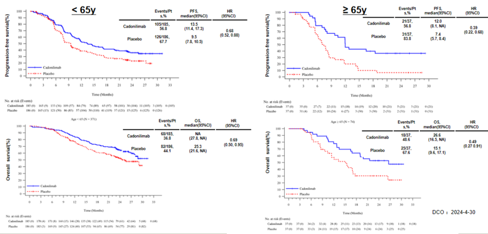 无论患者年龄如何,卡度尼利单抗均显著延长患者PFS和OS,其中≥65岁老年人群获益尤为突出(PFS HR=0.39,OS HR=0.49),mOS达26.6个月(vs 15.1个月),为高龄人群给予了高效且安全性可控的治疗选择。